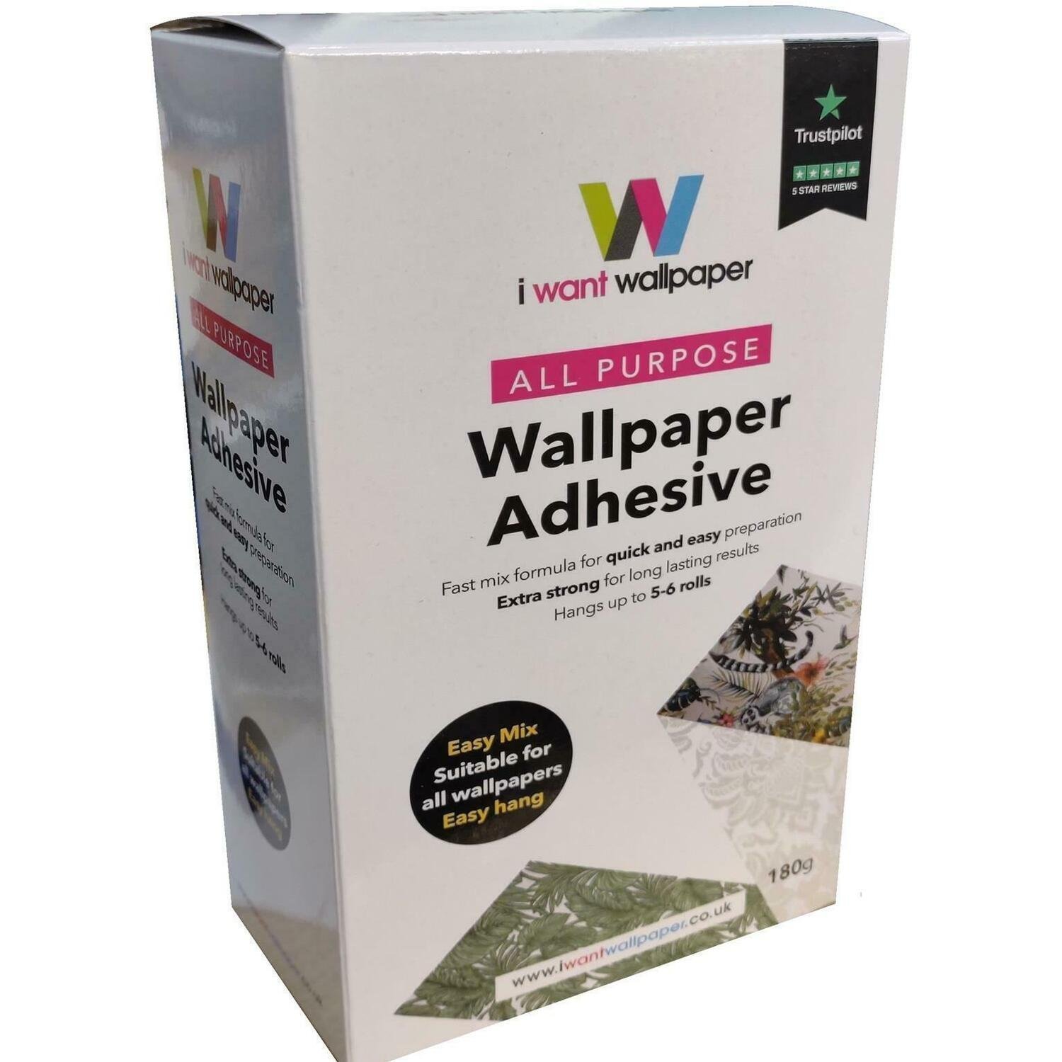 I Want Wallpaper All Purpose Wall Paste Adhesive Paper Glue Hangs upto 5.6 Rolls. It is a starch based powder adhesive suitable for various types of wallpapers, especially for vinyl, heavy weight wallpapers and wall cloth. Product is characterized by high efficiency and joint strength Easy mixing with cold water in 2-3 minutes. Creates an anti-fungal environment. Adhesive does not harm environment. Product is approved by National Institute