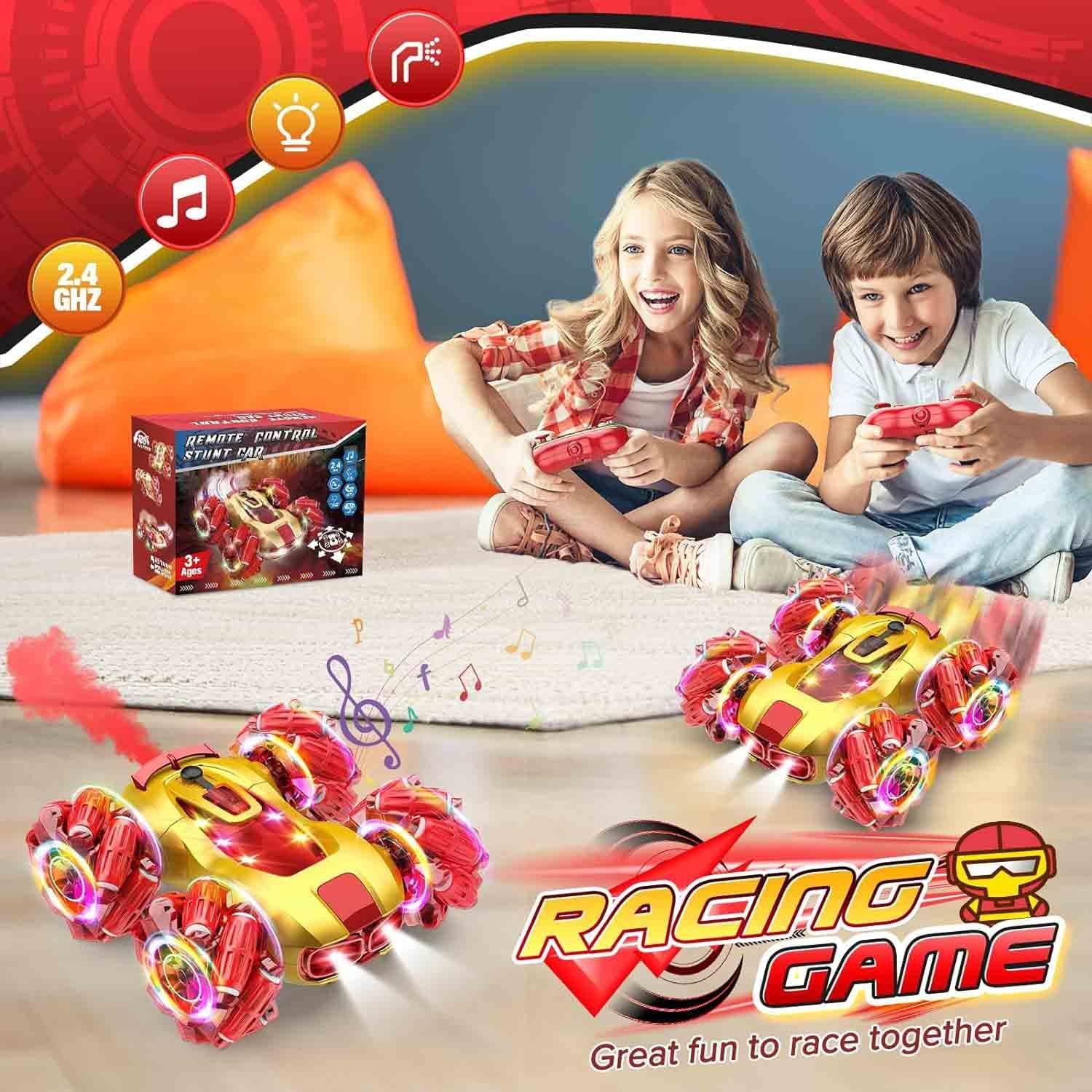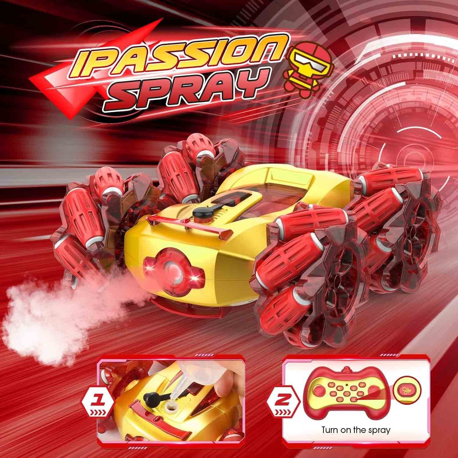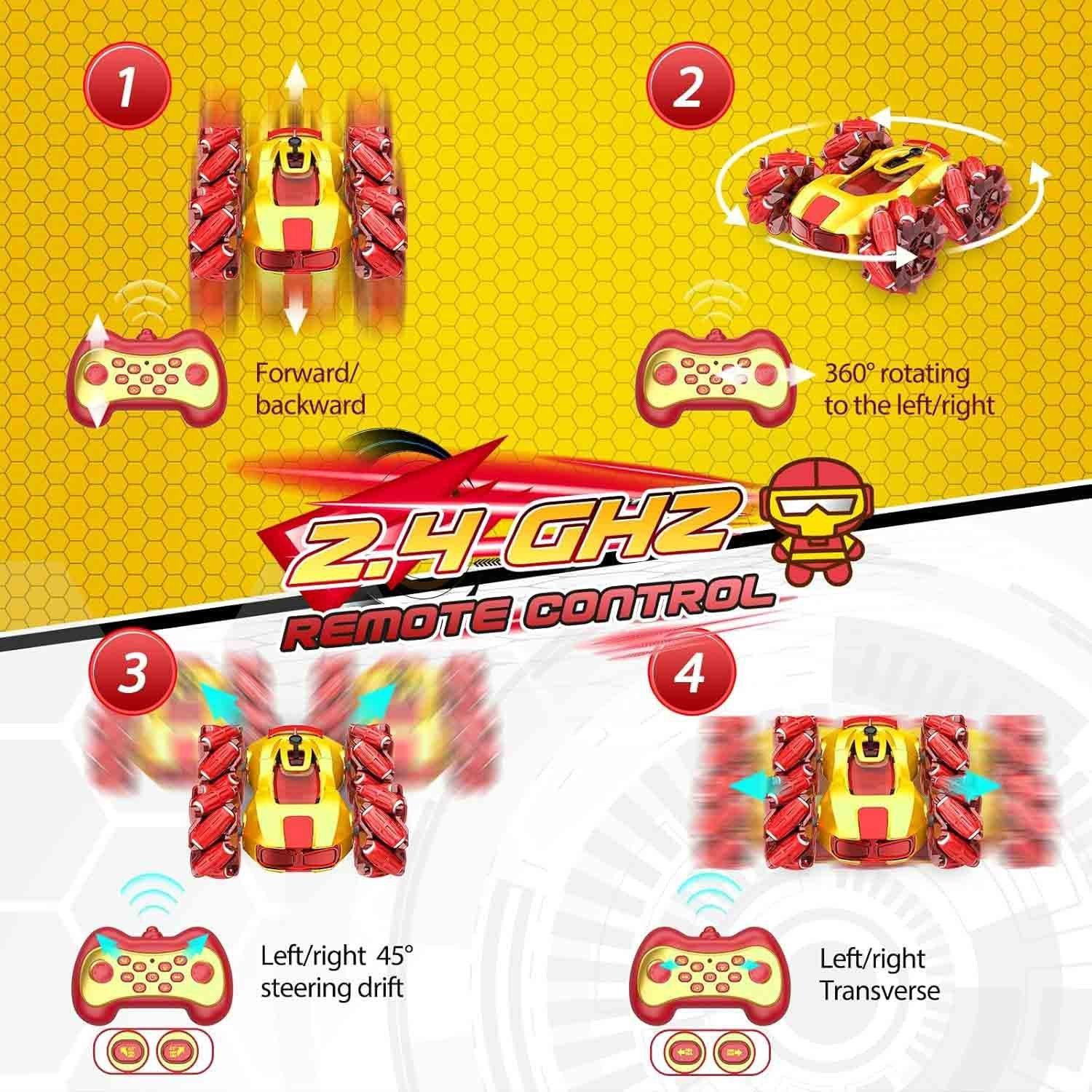 - ???Upgraded Multi-function?The remote control car has universal wheels, which can not only move forward and backward, rotate left and right, but also move flexibly in multiple directions, including 45? diagonal drift, left and right lateral drift, 360? rotation and double-sided driving. The stunt car comes with spray and music functions, and the body is designed with red and gold, which is very popular with children.