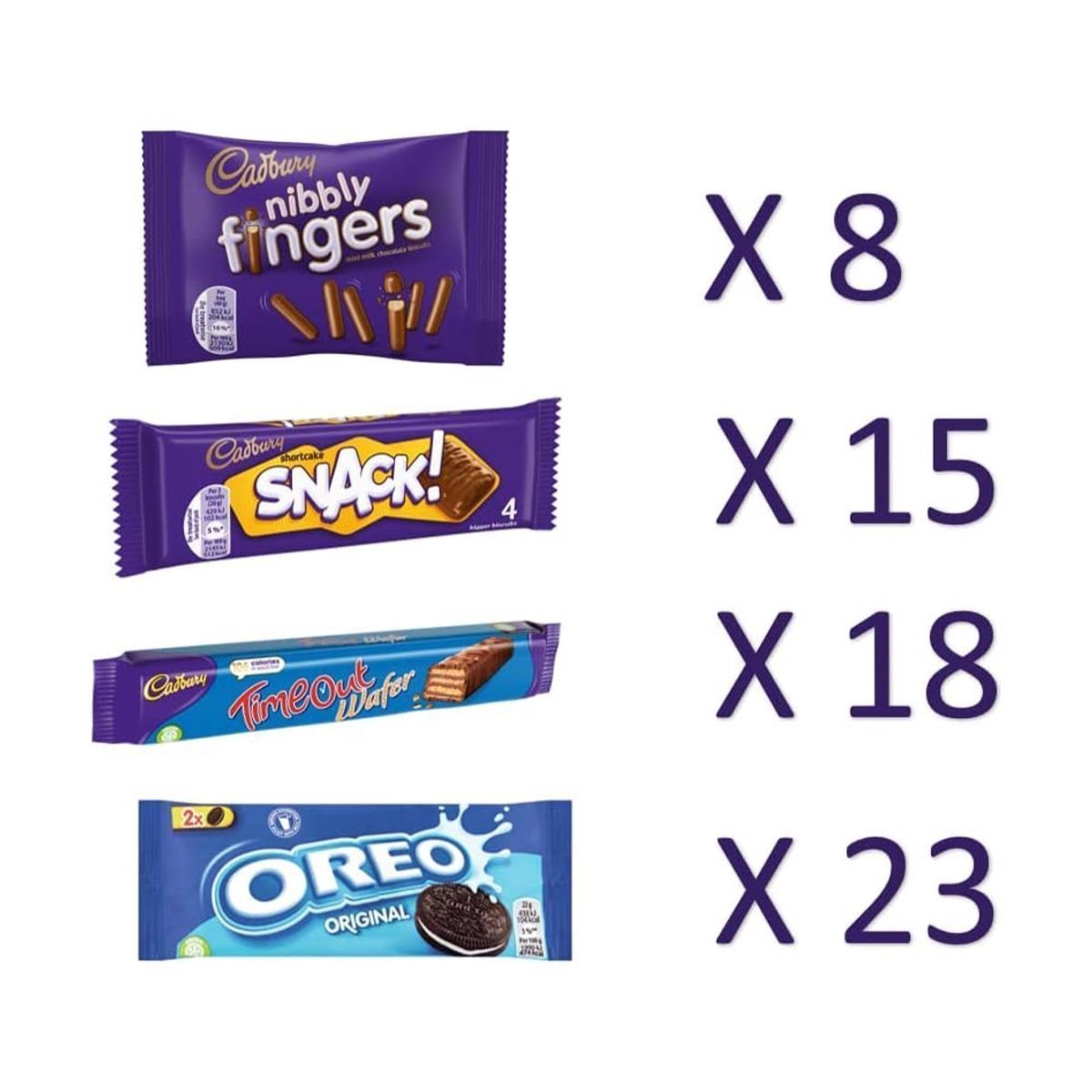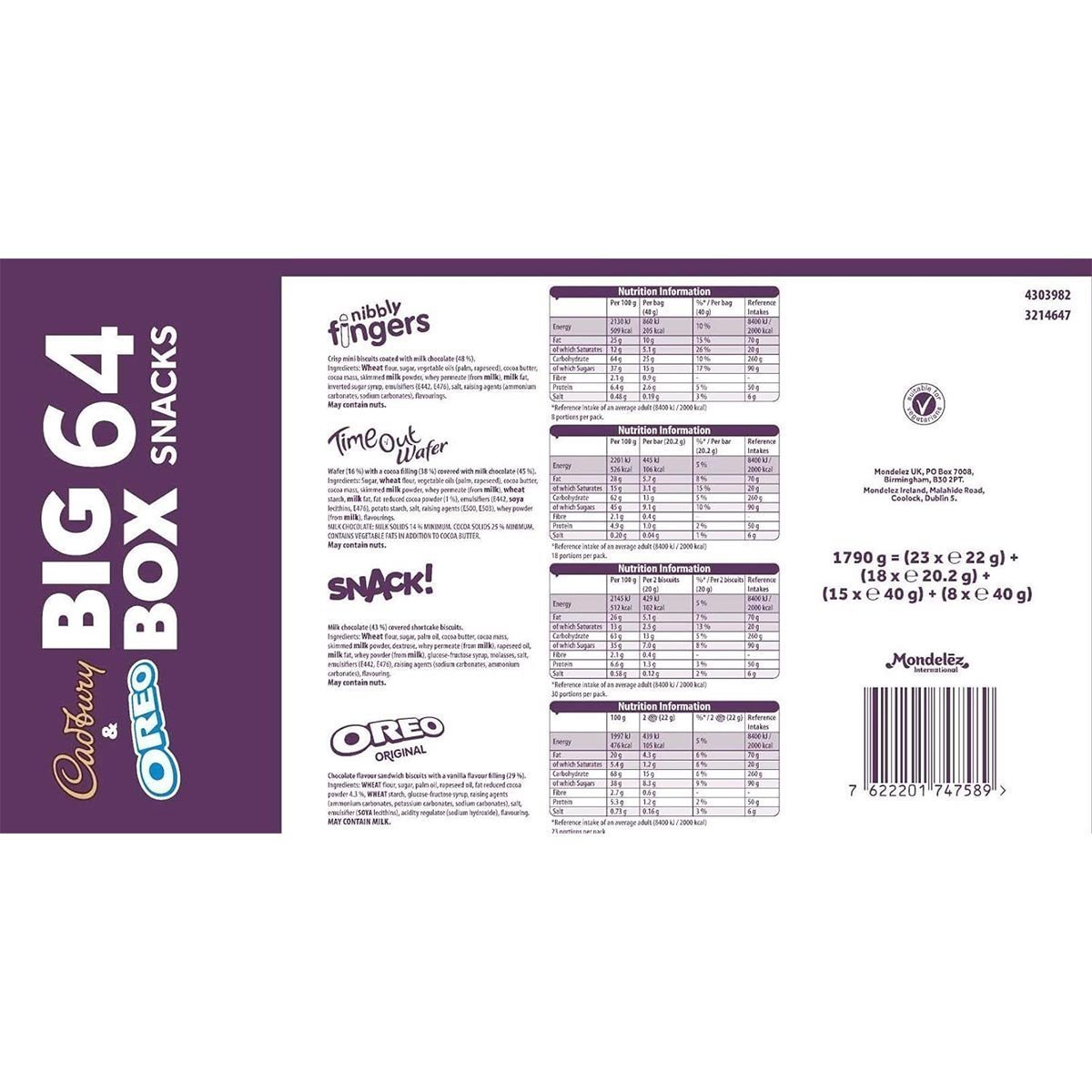 - Delivery contents: 1x Cadbury & OREO Big Box of Treats, Includes: Cadbury Nibbly Fingers, Snack, Time Out Wafer, OREO Twinpacks, 1790 g