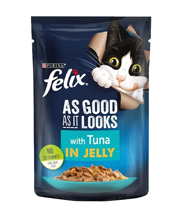 - ^ Felix As Good As It Looks Adult Wet Cat Food Tuna in Jelly 20 x 100g Pouches ^ 100% of your cat?s daily needs in one easy serving ^ Vitamins D & E help keep your cat supported with the right nutrients included ^ Sources of Omega 6 packed in our delicious recipes ensure your cat is supported as he grows ^ Vets and nutritionists have specially developed our recipe to make sure it’s as good as it looks ^ 100g (20 Pouches)