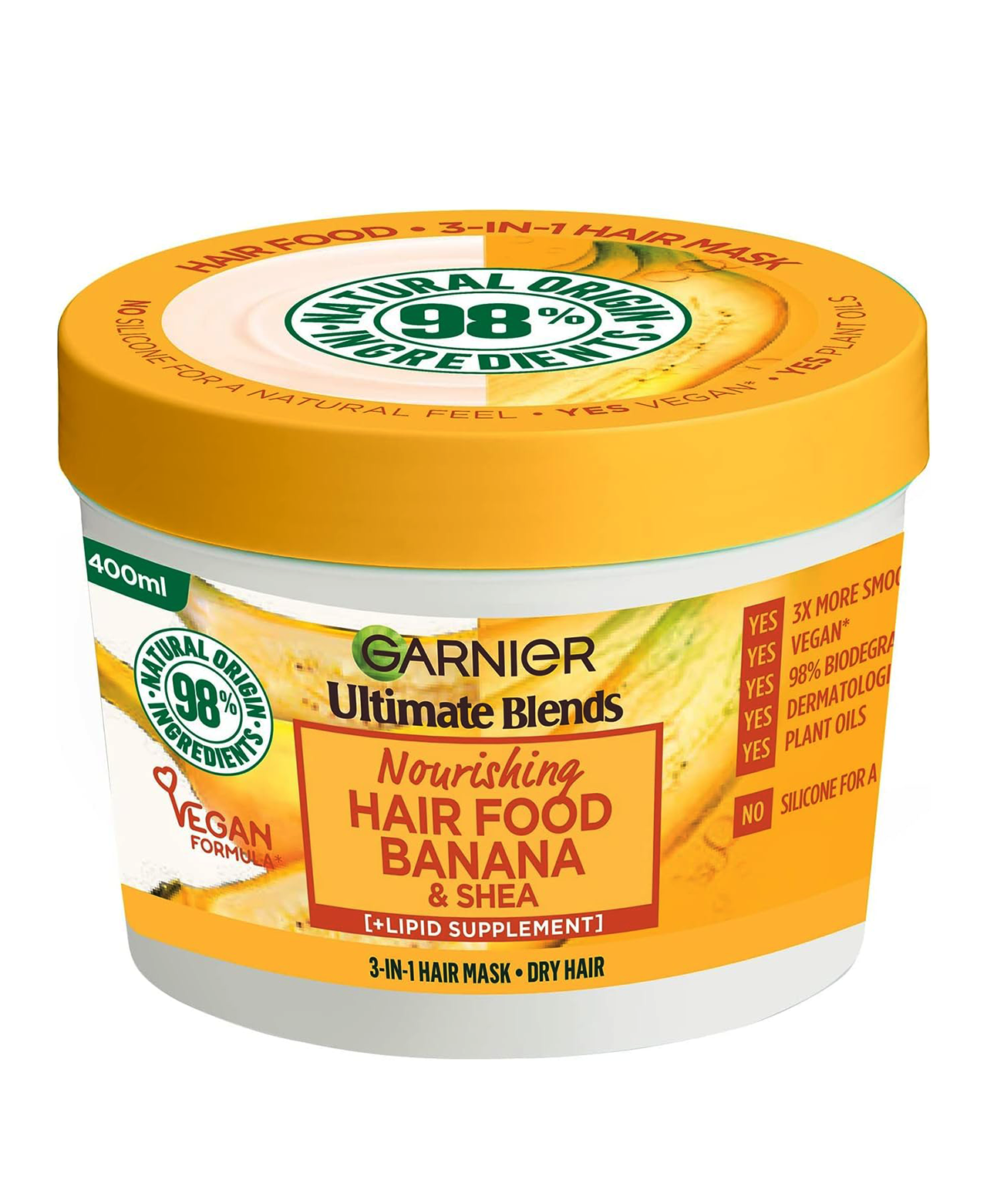 - Contents: 1x Garnier Ultimate Blends Hair Food, Banana 3-in-1 Normal Hair Treatment Mask, For Dry Hair, Vegan Formula, Volume: 400ml
