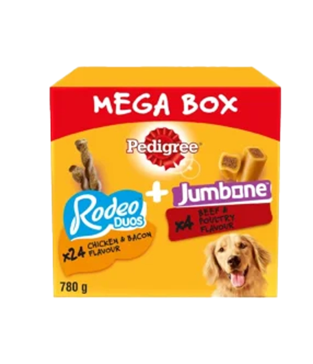 - Items delivered: 780 g Pedigree Mega Box of dog treats with 24 x Rodeo Duos in chicken and bacon flavour and 4 x Jumbone in beef and poultry flavour, suitable for adult dogs of all sizes and breeds