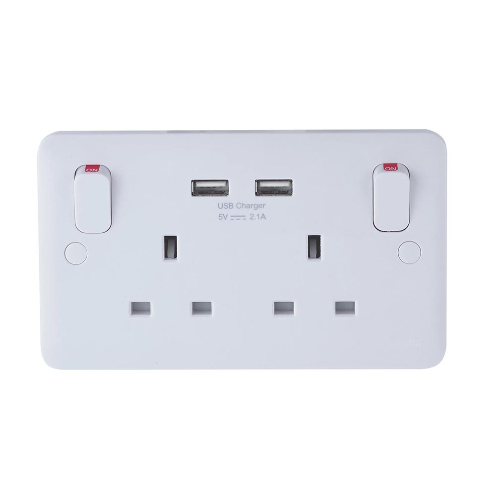 SCHNEIDER ELECTRIC LISSE 2.1A 2-GANG SP SWITCHED SOCKET + 2.1A 10.5W 2-OUTLET TYPE A USB CHARGER WHITE (5429J)